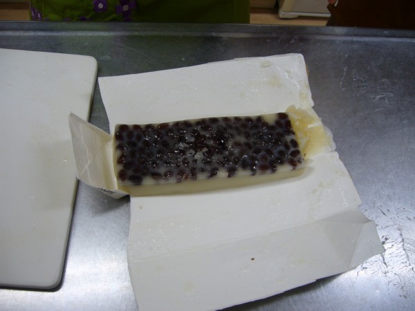 - 牛乳パックに①の生地をを流し入れ、甘納豆も加える。牛乳パックを横にし、甘納豆が底全体にいきわたるように左右&奥手前に揺すり、電子レンジで約7分(500wの場合)加熱する。そのまま冷ます。