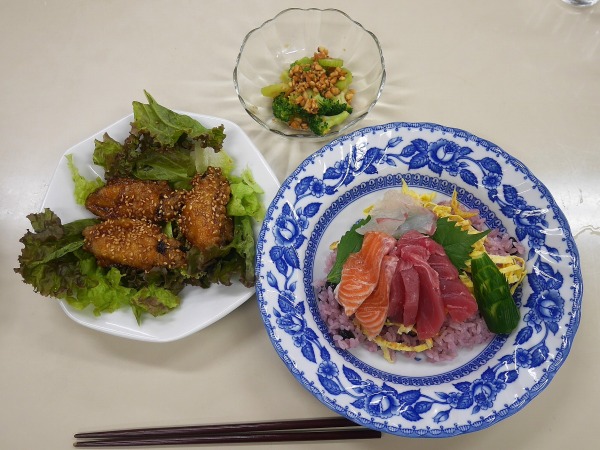今回は、櫻田さんが欠席されました。本日は「黒豆入りちらし寿司」「鶏手羽先の甘辛煮」「ブロッコリーのピーナッツ和え」の3品です。