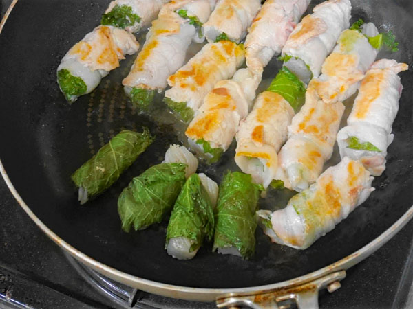 - フライパンにごま油を熱し、①の巻き終わりを下にして、中火で焼く。巻き終わりが焼けたら、転がして全体を焼く。余分な油をふき取る。