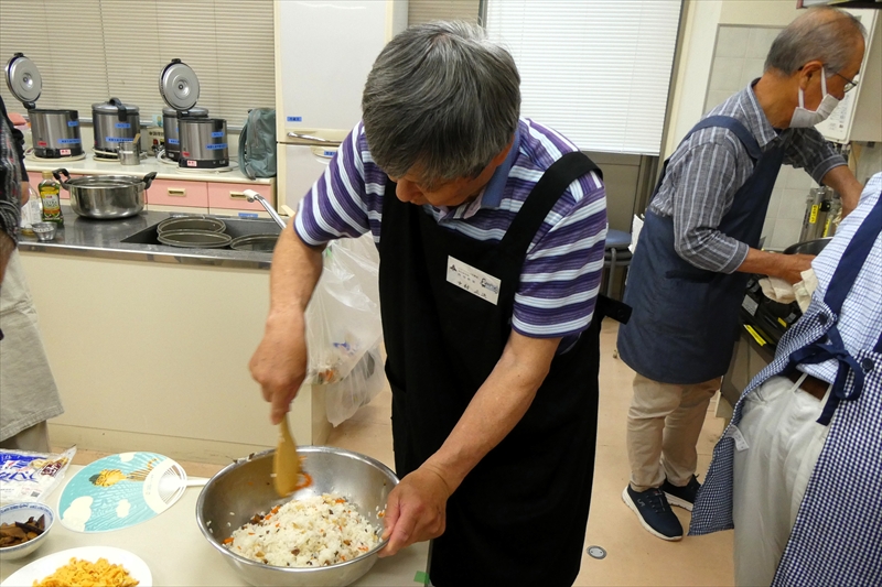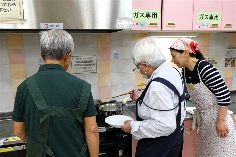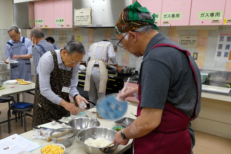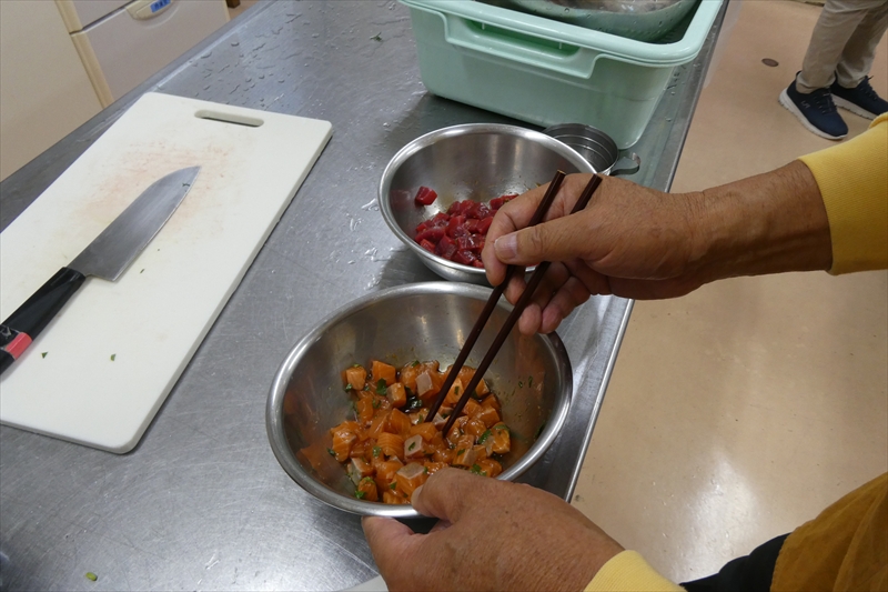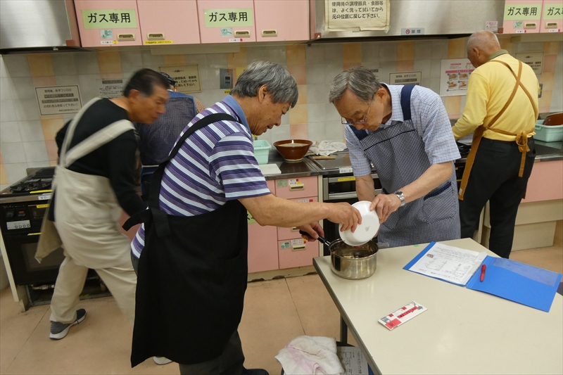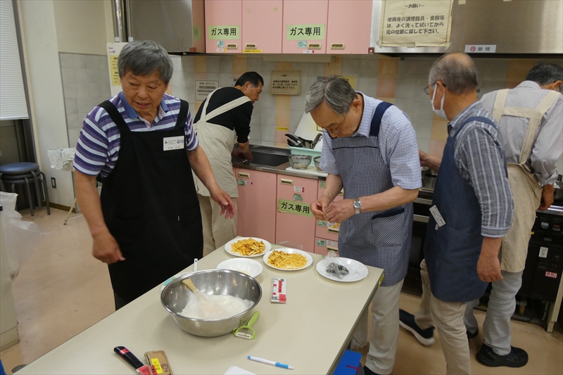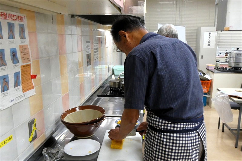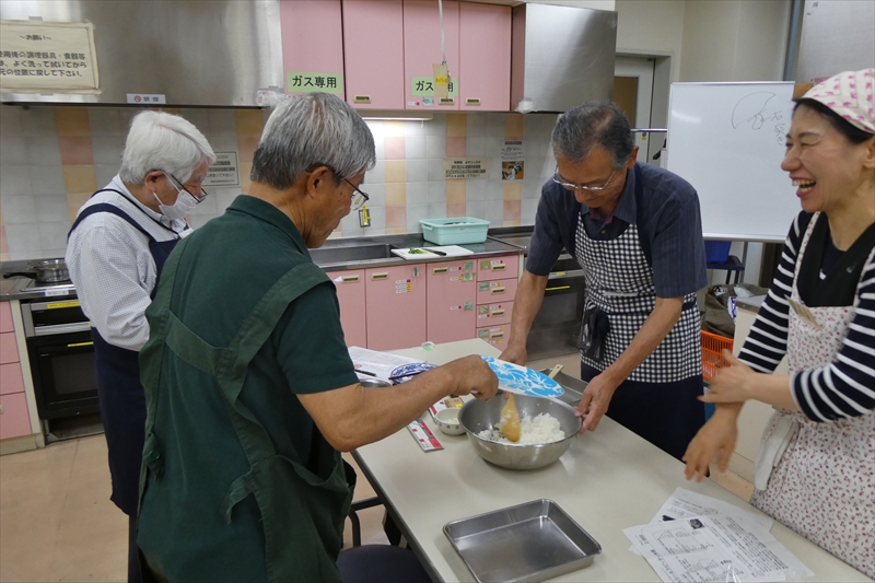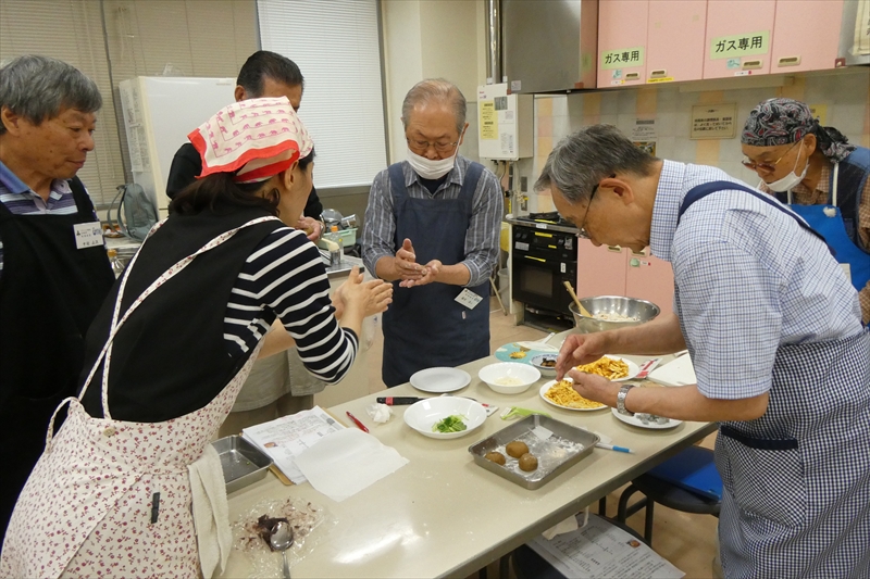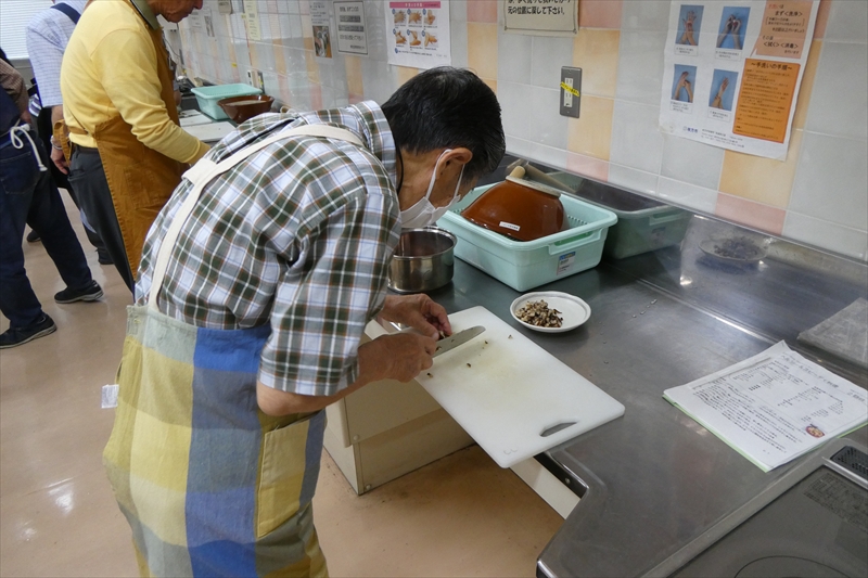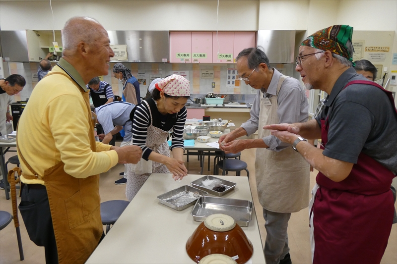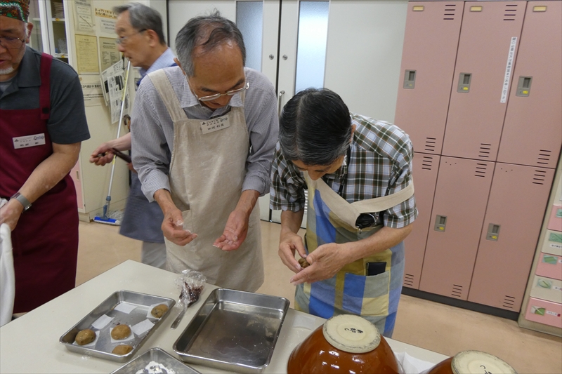 「海老真薯汁」も海老たっぷりでおいしくいただきました。「利休まんじゅう」は、生地は加藤先生が作ってきてくれましたが、餡を包むのが意外とむずかしく大変でした。