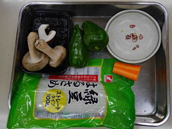 - ピーマン、にんじん、しいたけは、せん切りにする。