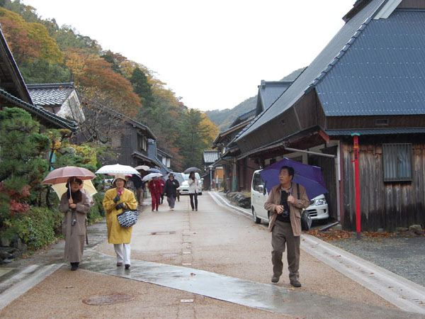 予定には無かったが「若狭フッシャーマンズ・ワーフ」に立寄り、若狭名物の焼き鯖・鯖寿司・越前ガニ等をお土産として購入。この間も雨は降ったり止んだりで、次の目的地「熊川宿」では傘をさして約1.5kmを散策。
