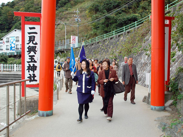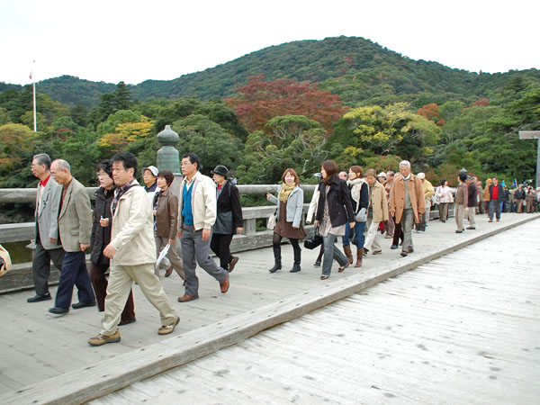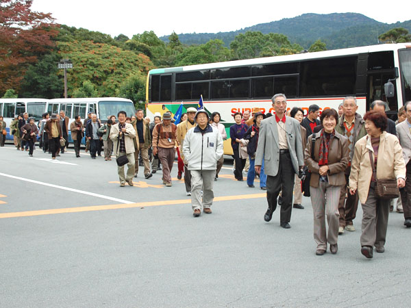 今年の秋レクは、11月11日(火)74名の参加のもと、秋の伊勢参りの旅を実施。朝8時に2台の貸切バスで出発、新しくできた第2名神を走行、両側に美しい紅葉のロケーションを見ながら、先ずは「二見ヶ浦」を訪問。今回24組のご夫婦が参加され「夫婦岩」をバックに仲良く記念写真を撮ったり、仲睦まじい光景が多く見られました。2~3前まではシャッター音があちこちで聞こえていましたが、今では静かなデジタルカメラ・・バックの「夫婦岩」さんも時代の流れに驚かれている様にも見えました。