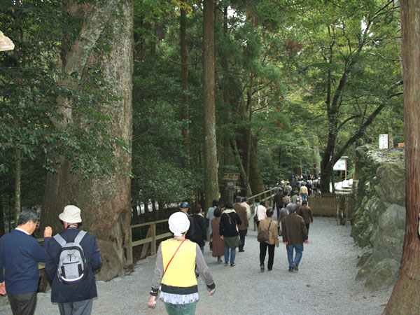 平日にもかかわらず多くの参拝者で、深く豊かな森に包まれた中を「ジャリジャリ」と玉砂利を踏みしめて歩き、それぞれの願いを込めて伊勢神宮に参拝しました。参加した皆さんは、これで新たな年が迎えられるとの思いを深めました。今年は入口の宇治橋が架け替え途中のため、現在の橋の最後との思いをこめて渡り、心清めて参拝いたしました。