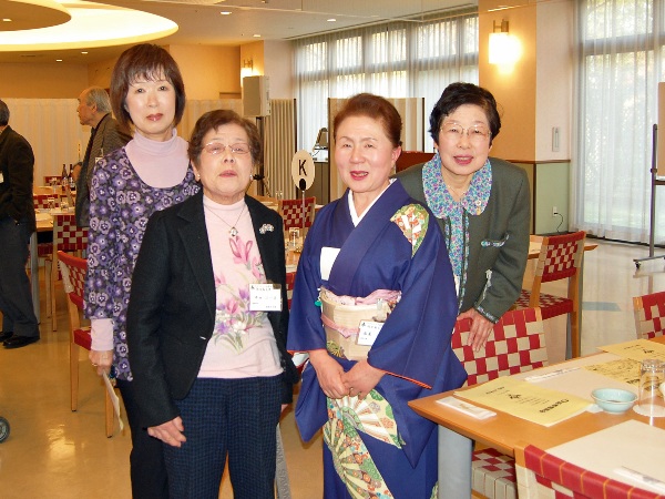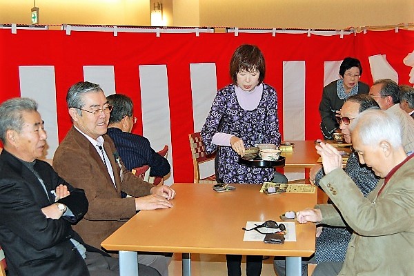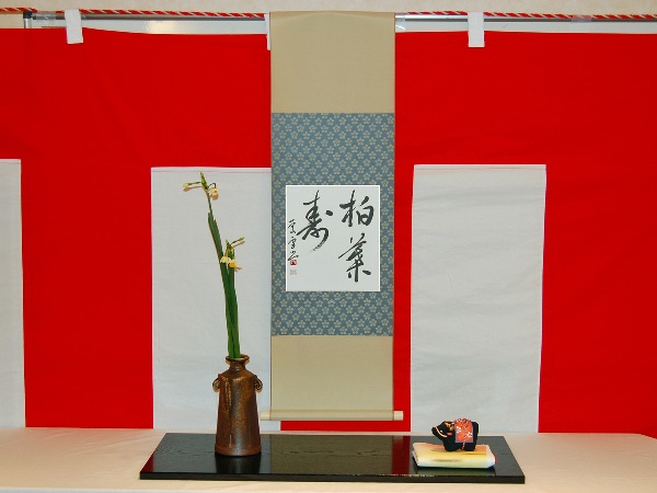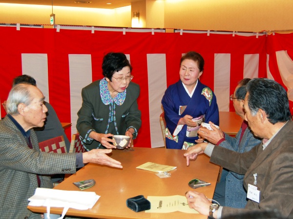 懇親会までのひと時を、紅白幕を巡らし、干支の置物と「柏葉壽」の掛け物、「お猪口水仙」を生けたお茶席で、「春の海」のBGMが初春の雰囲気を醸し出す中、女性会員のお点前を堪能されながら、多くの方が新年の挨拶を交わしておられた。