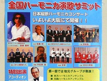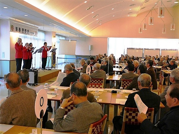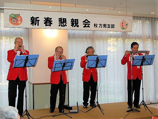 続いてアトラクションとして、松愛会会員中心のハーモニカ・カルテット「河内口琴隊」による演奏が行われた。テーマ曲の「河内おとこ節」からスタート、会員の過ごした時代にふさわしい曲が次々に演奏され、演奏に合わせ自然に合唱も始まり、あたかも往年の「歌声喫茶」の和やかで楽しい雰囲気に包まれた空間となった。