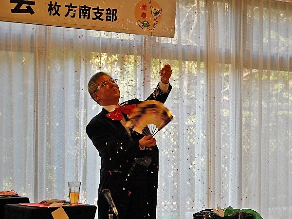 第2部は福留枚方市会議員の挨拶の後、土井支部長の乾杯で始まり、平野衆議院議員の挨拶や畠平地区委員のマジックを交えながらの懇談が行われ、皆さんそれぞれ新年の思いや趣味の話など、親しい方々が集まって歓談され大いに盛り上がった。
