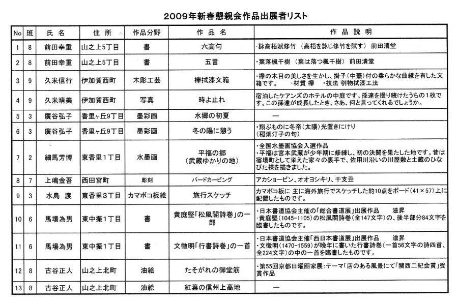 好評の会員西尾千鶴子さんのご尽力によるお茶席、恒例の作品展示会、およびホームページ掲載の写真をスライドショーとして放映し、1年間の活動を振り返るコーナも昨年同様設けられた。