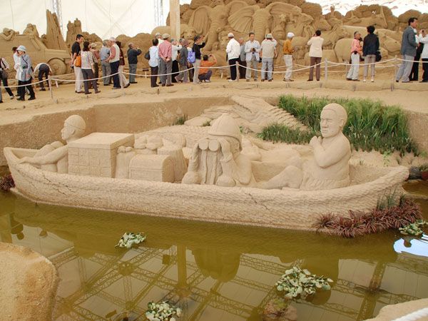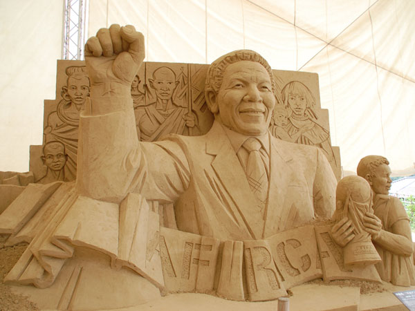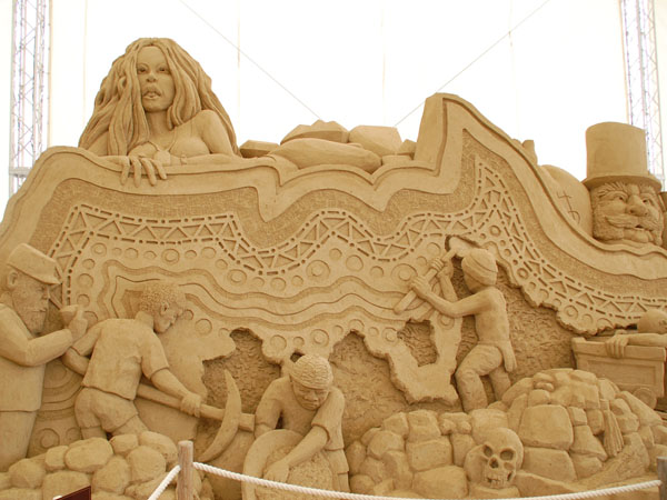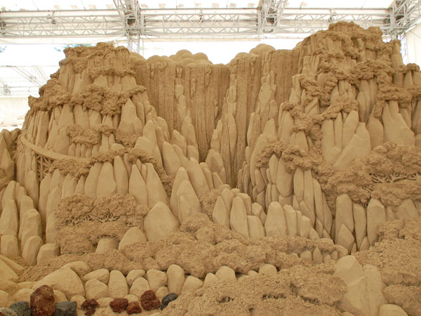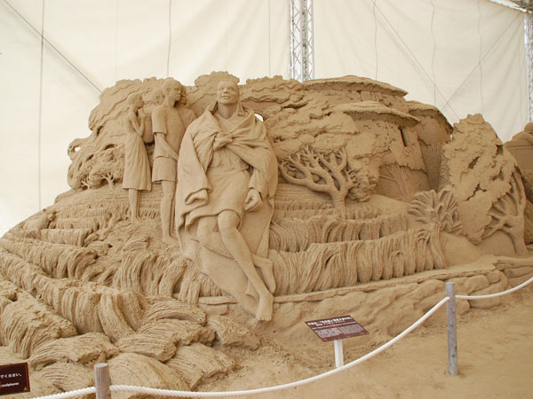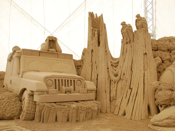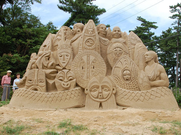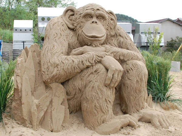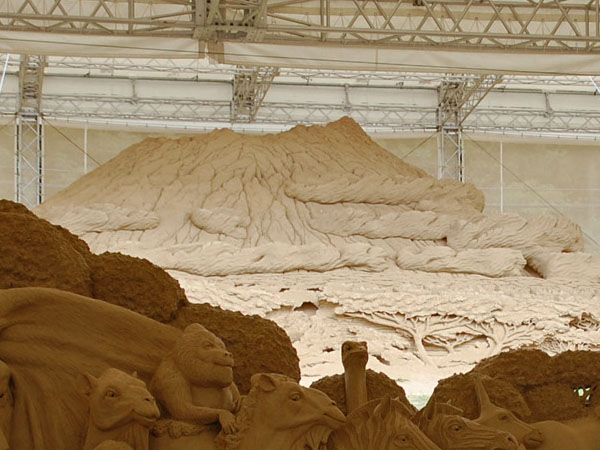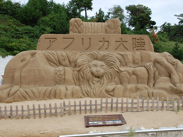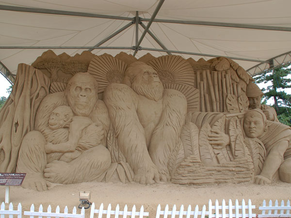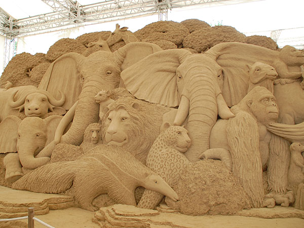 入口周辺には大小の砂像が私達を迎えてくれました。入場ゲートに入れば そこは”アフリカ”、巨大なゴリラの森やサファリ、アフリカの野生など、世界各国13名の彫刻家が作った砂像の迫力ある11作品に感動。砂像が出来るまでの工程を係員に聞いたり、砂像をバックに記念写真を撮ったり、雪像とはまた違った砂アート空間を楽しみました。
