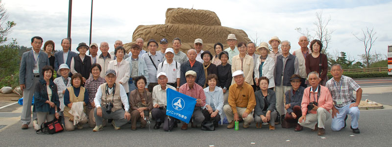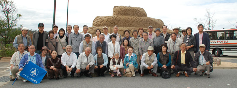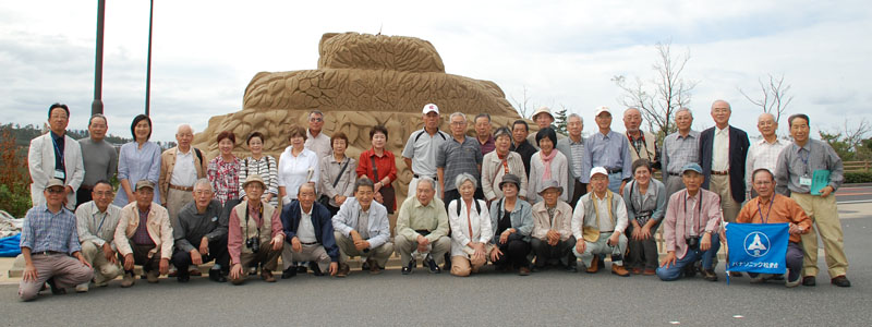 2010年秋のレクは9月29日(水)、鳥取砂丘「砂の美術館」と旬の二十世紀梨狩りの日帰旅行を楽しみました。枚方南支部発足以来、最高の120名(内ご夫婦33組)が、ラポール駐車場に朝早くから元気な笑顔で集合、大型バス3台に乗車し8時に出発。久し振りの再会で、会話や笑い声で車中は和らいだ雰囲気の中、第二京阪⇒近畿⇒中国道と快適に走行。