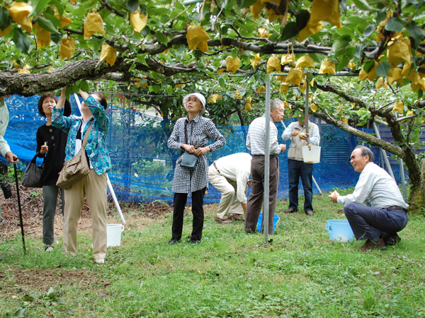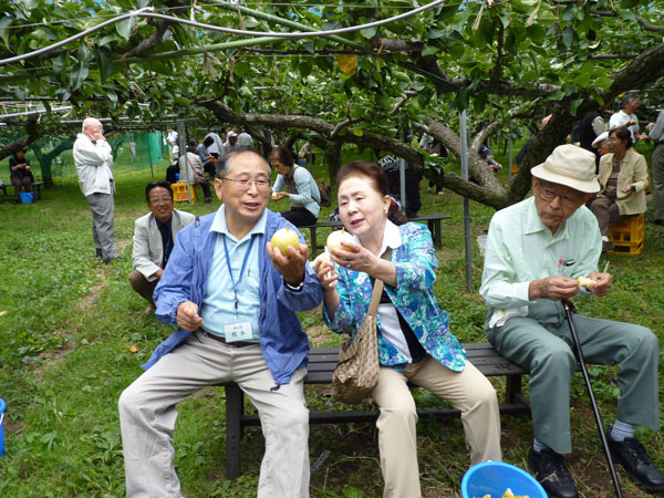 次の目的地の「ふくべ街道梨狩り園」へ、係の方から梨の取り方の説明を受け、ナイフとバケツを持って梨園に入り、実った梨の枝を折らないようにもぎり取り、果汁たっぷりのもぎたてを味わいました。 園内では仲良く食べ比べたり、美味しさのあまり3~4個も食べられた方もおられ、秋の味覚を楽しみました。美味しかった二十世紀梨のお土産ももらい、梨園の方に見送られる中、最後の目的地「賀露港」へと向かいました。