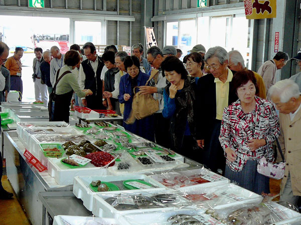 海の幸の店内に入ると、生魚や乾物等が多く並べられており、売れ筋のカレーの干物やのどくろ等、店方との値段交渉をしたり駆け引きを楽しみながらの買物でした。楽しい行程も終わり、車中は多くのお土産で一杯。西の空の薄い雲に追われながら一路枚方を目指して走行。鳥取⇒岡山⇒兵庫⇒大阪の4都を繋ぐバスの旅の帰途、中国道で少し渋滞に遭うが、枚方郵便局前に19:30頃全員無事帰着。皆さん本当にお疲れ様でした。
