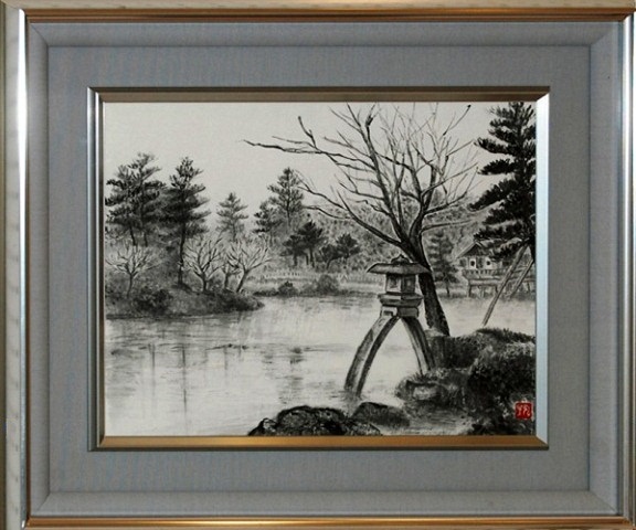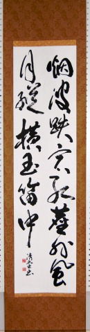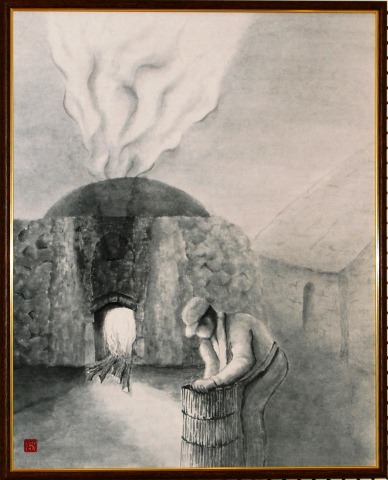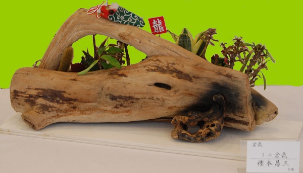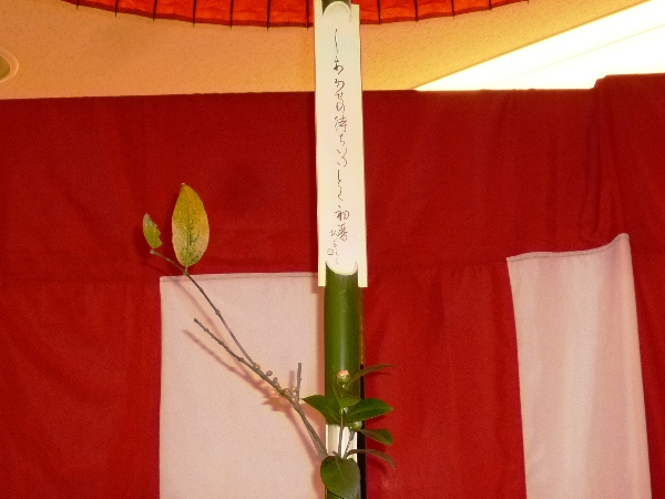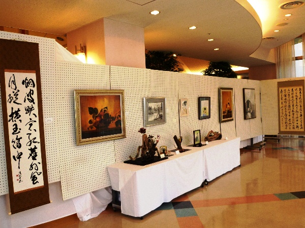 懇親会までのひと時を、紅白幕を巡らし、廣谷弘子会員の書による「幸せの待ち居る如く初暦(稲畑汀子)」の短冊、「蝋梅と椿」の生花等で飾られたお茶席で、「春の海」のBGMが初春の雰囲気を醸し出す中、女性会員のお点前を堪能されながら、多くの方が新年の挨拶を交わしておられた。また作品展示コーナーも、洋画・水墨画・書・彫刻・墨彩画など13作品が展示され、沢山の方が鑑賞されていた。