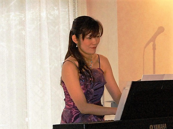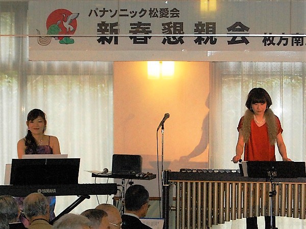 続いてアトラクションとして、マリンバとキーボード演奏、及びその伴奏で出席者全員で懐メロ合唱を楽しんで頂いた。マリンバ奏者の奥田さん、キーボード奏者の井上さんは、現在活躍中の「カシュカシュ」(女性4名)のメンバーで、お二人のパワフルで息の合った演奏で会場は一体となり、「歌声喫茶」の雰囲気で、多くの懐メロを全員で熱唱されていた。(クリックすると「青い山脈」合唱が聴けます)