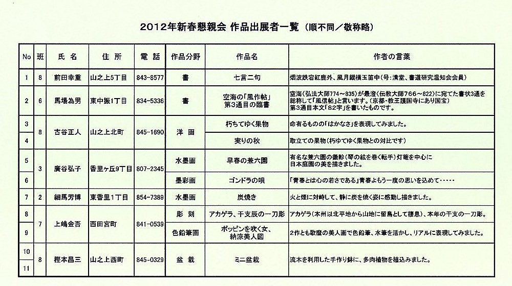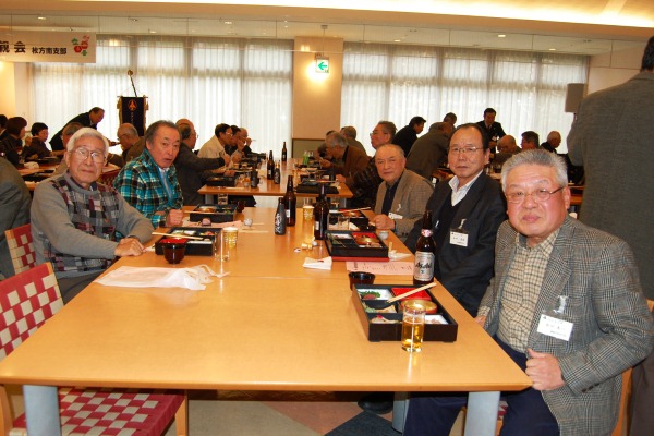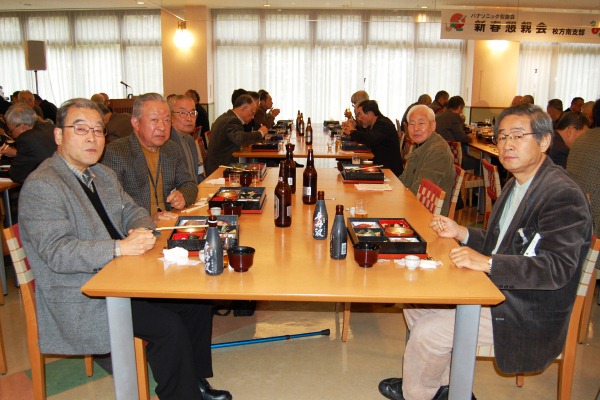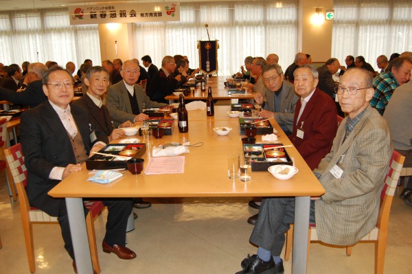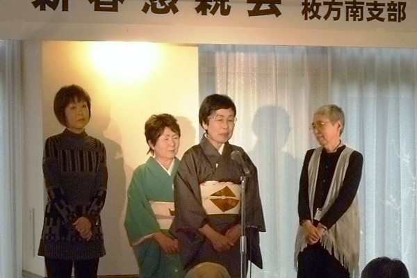2012年の枚方南支部「新春懇親会」は、1月14日(土)枚方のパナソニック人材開発カンパニーにて、146名の参加で開催された。毎年好評の西尾千鶴子会員のご尽力によるお茶席、恒例の作品展示コーナーに加え、映像コーナーではHP委員会による同好会活動紹介が動画及びスライドショーとして放映された。
