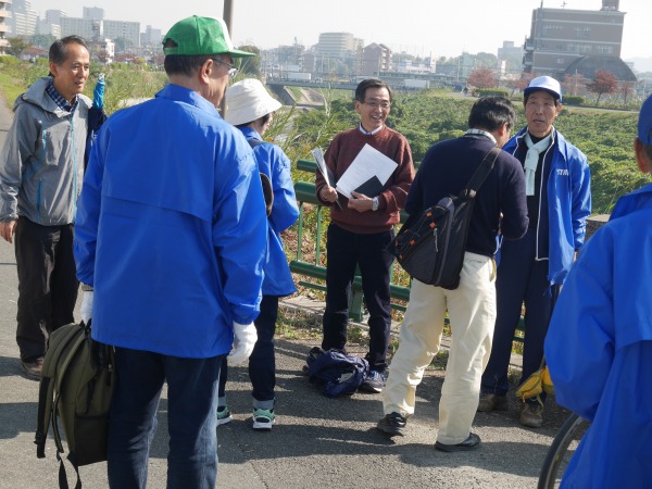 今年も晴天の中、集合場所である「天津橋北詰(右岸)上流側の河川公園」に各企業・市民団体・地域・学校の方々に交じって、当支部の皆様も集合しました。 主催者のあいさつの後、支部参加者で集合写真を撮り、作業開始しました。