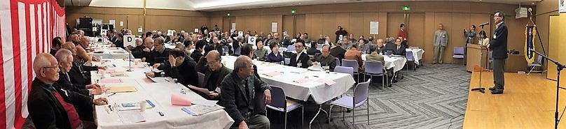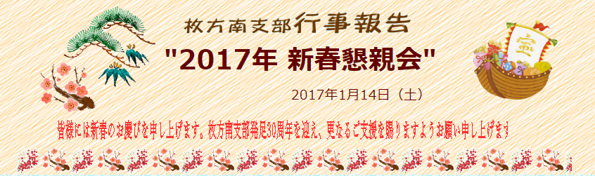 2017年の枚方南支部「新春懇親会」は1月14日(土)門真の松心会館にて、御来賓並びに女性会員8名を含めた支部会員の会員皆様144名の参加のもとで開催致しました。アトラクション、懇親、作品展示を通して親睦と友愛をより深めました。