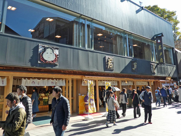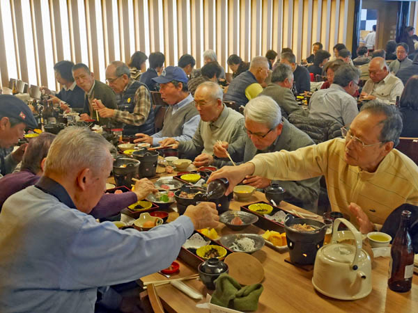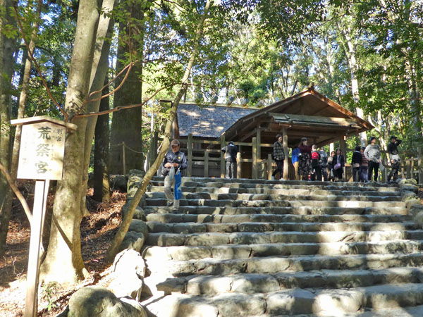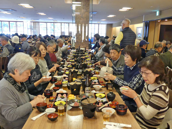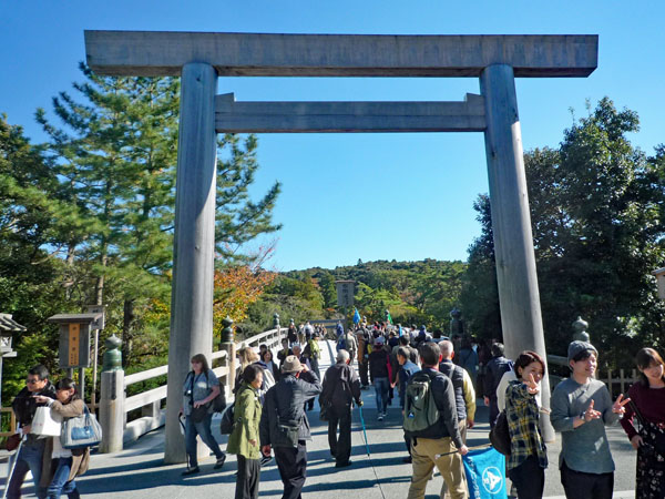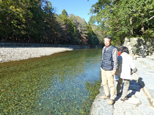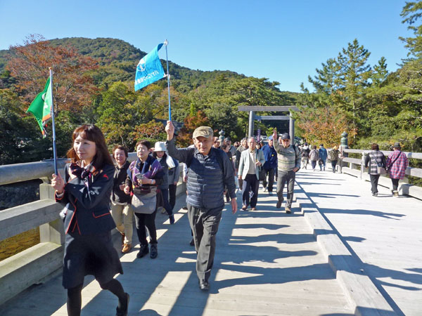 昼食休憩場所の「岩戸屋」は、外宮からバスで約20分の内宮玄関の宇治橋の近くにあり、11月のリフォーム直後で綺麗。岩戸餅、生姜糖をはじめ、種類豊富なお土産を取り揃えており、ユニークなお多福の看板がお客様を迎える。ここでは評判の「秋桜定食」に舌鼓、ほろ酔い気分で次に向かったのは「内宮」。