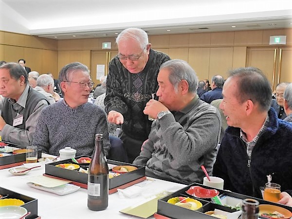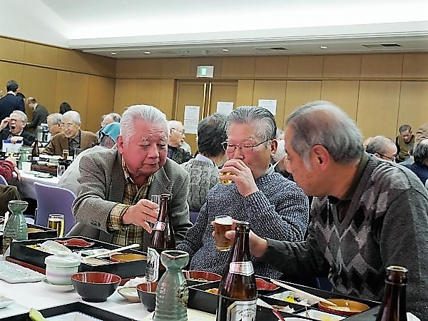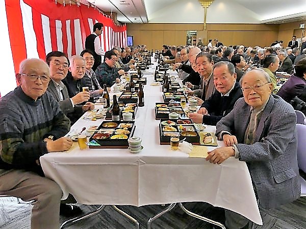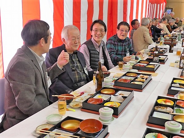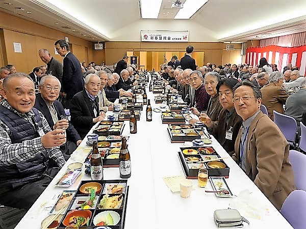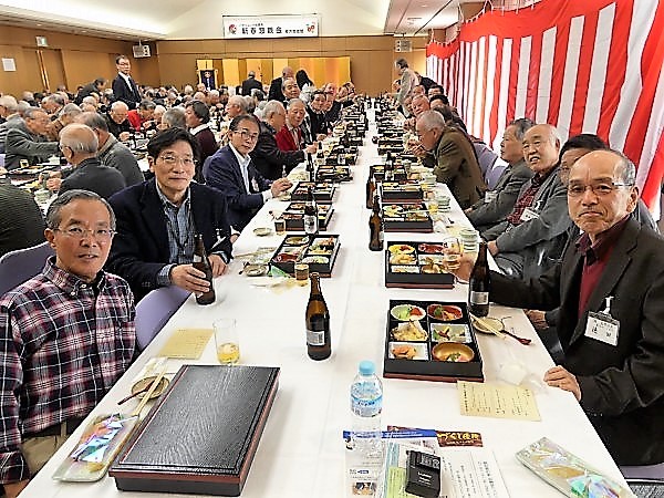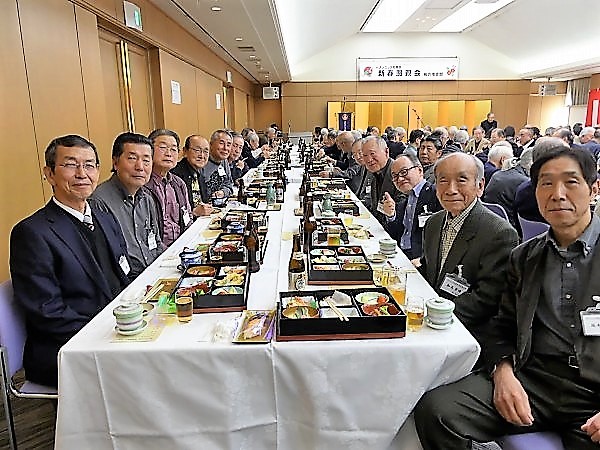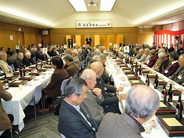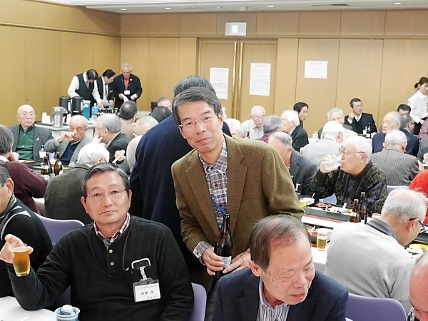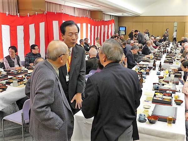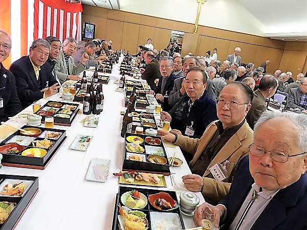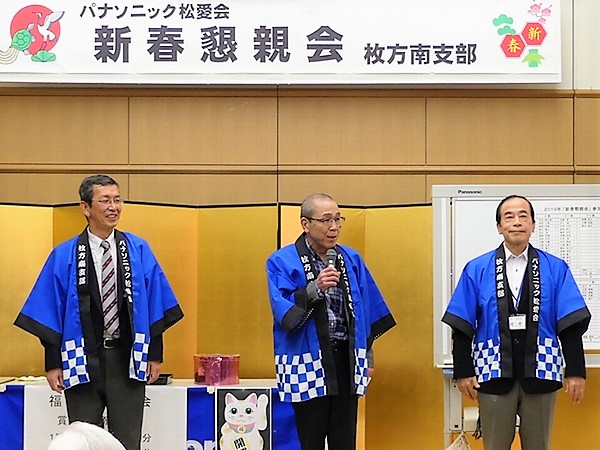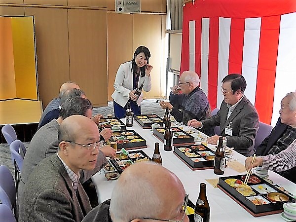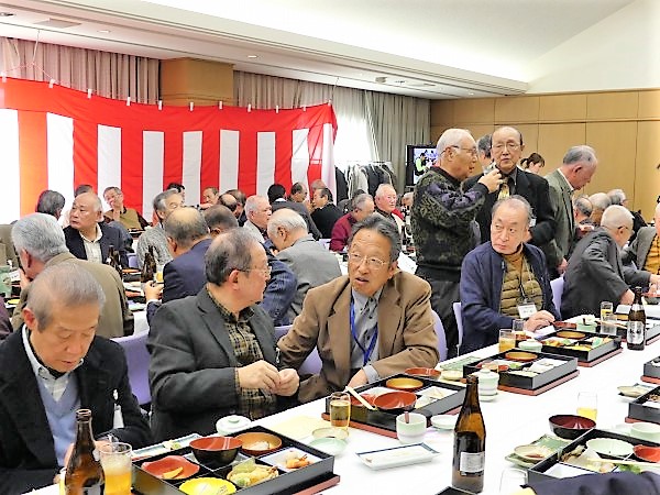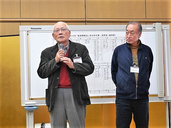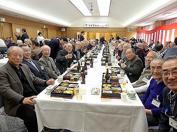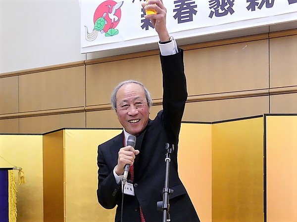 その為にも、松愛会では「ボーっと生きてんじゃねえよ!」と、あのチコちゃんに叱られない様、スローガン「仲間と地域、笑顔で健康」を合言葉に、次のステージに向かってしっかりと準備して、新たな行事の実現と、皆様方との信頼の絆を深め、努力して参りますので宜しくお願い申し上げます。 最後に、今回は平成最後の新春懇親会です。5月には「元号」が変わり、大きな節目の年、時代の変化を感じさせる年になると思います。そして今年はラグビーワールドカップ、来年は2020東京オリンピック/パラリンピック、2025大阪万博、2027リニア新幹線等ビッグイベントが続きますが、今後ともお元気でご活躍されます事を祈念申し上げ、ご挨拶とさせていただきます。』と今年の活動の決意を語られました。