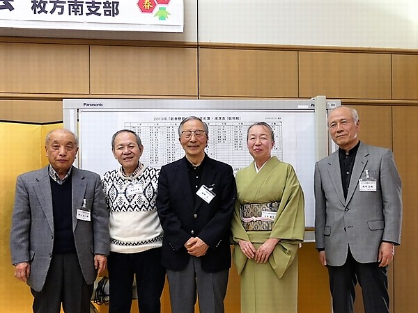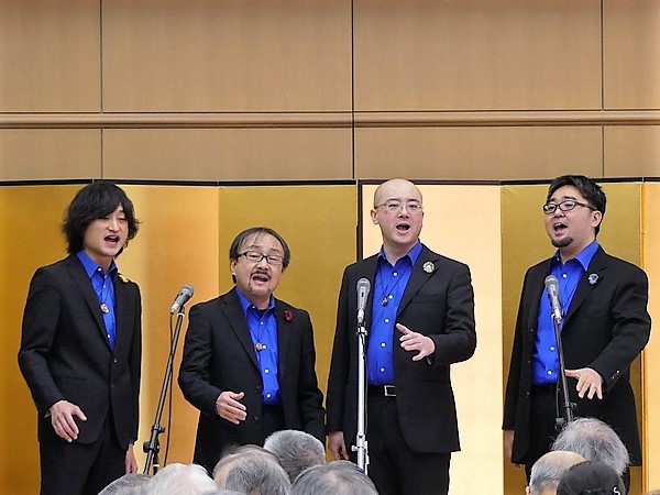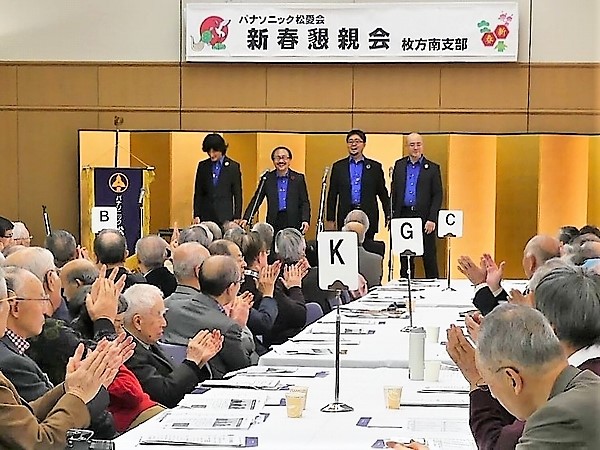 2019年の枚方南支部「新春懇親会」は1月19日(土)門真の松心会館にて、女性会員7名を含めた支部会員169名の皆様と御来賓を含めて総勢173名の参加のもとで開催いたしました。アトラクション、作品展、懇親会を通して親睦と友愛をより深めました。第一部は『STARGAZER』(スターゲイザー)男性4名で結成されたアカペラカルテットによる、完璧な四重唱から生まれるハーモニーを楽しんでいただきました。新春にふさわしいステージになり、枚方南支部会員の創られた「松愛賛歌」を含めて13曲(アンコール1曲含む)を熱唱されて、大いに盛り上がりました。