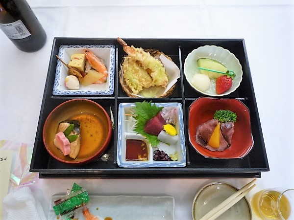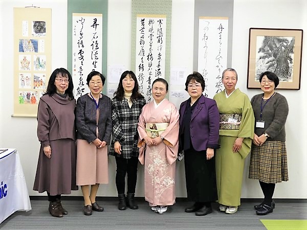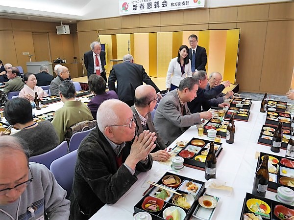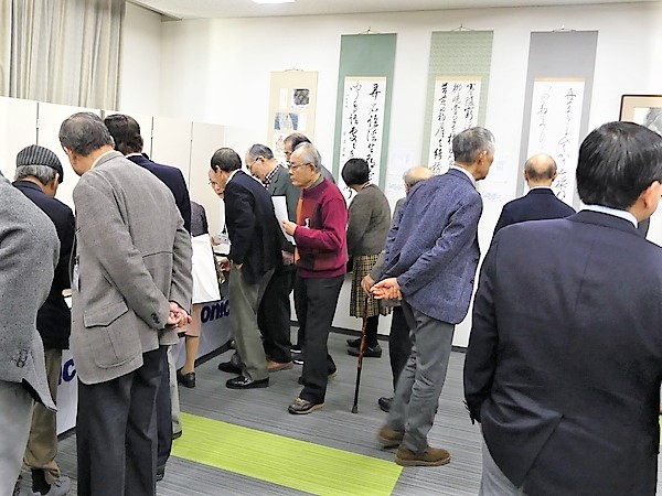 第二部は、懇親会会場準備の時間を利用して別室に移動し、会員有志皆様の作品展を見学していただきました。出展分野は工芸・墨彩・水墨画・日本画・洋画・写真・手芸・書など多岐にわたり、18会員様・28作品の力作を全員で熱心に鑑賞しました。第三部では御来賓の矢田参議院議員・福留枚方市議会議員の挨拶の後、松愛会の上田会長による乾杯でスタートしました。途中で平野衆議院議員の挨拶がありました。会食を挟んで新年の挨拶をするたくさんの歓談の輪が出来る懇親会と毎年恒例の9名の会員に幸運が当たる福引抽選会で今年も盛り上がりました。