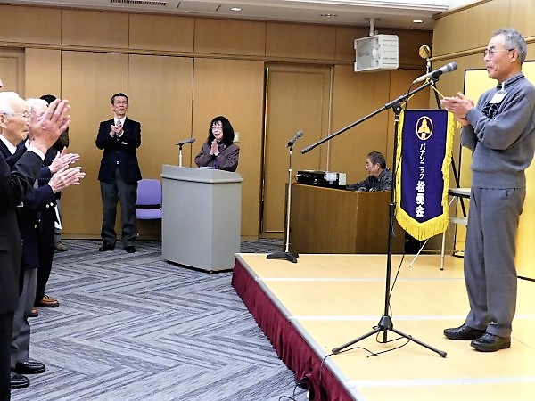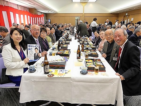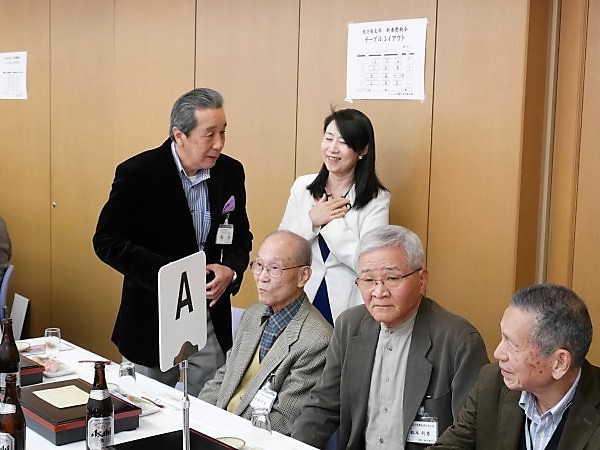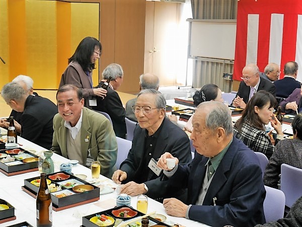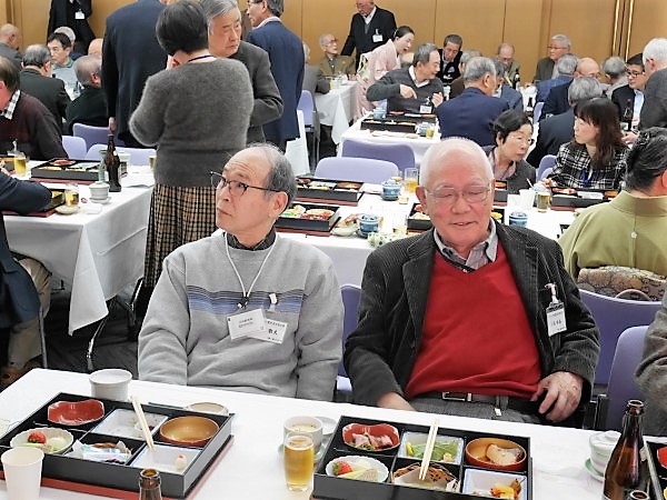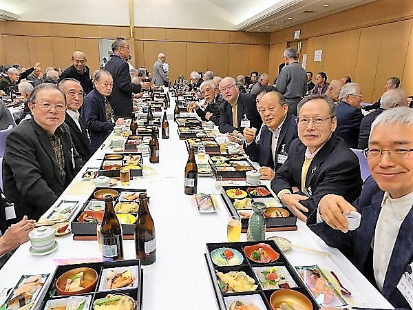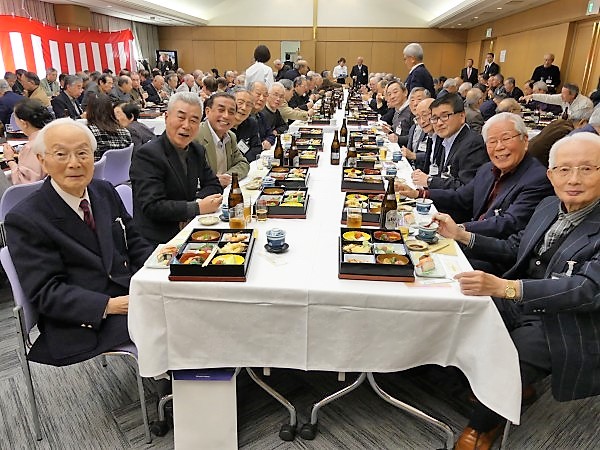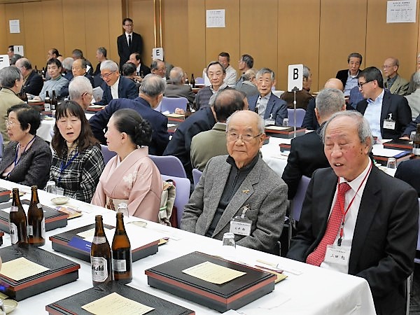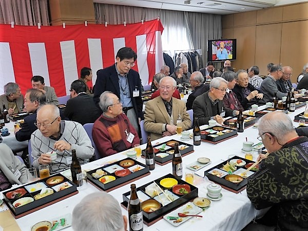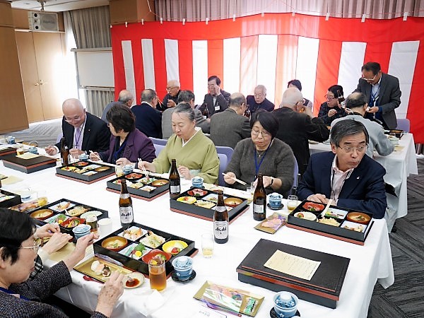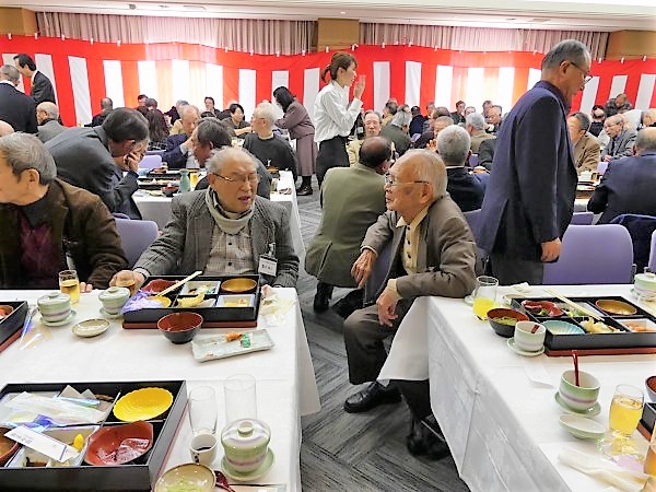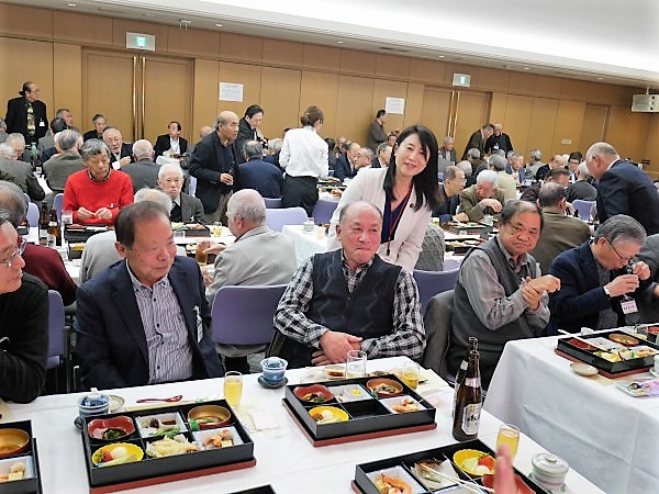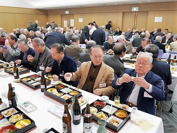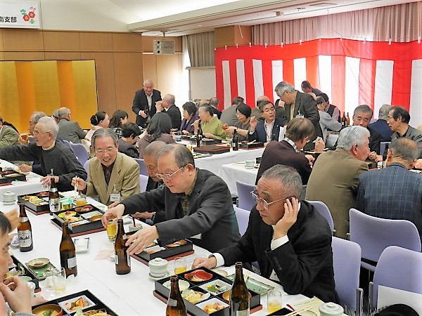 新春懇親会は、黒田支部役員(女性担当役員)の司会で始まり、櫻田支部長は挨拶で『本日の新春懇親会には、ご来賓を含め173名様がご出席、昨年よりも10名様が増加し、2年続けて過去最多を更新することができました。誠に有難うございました。本年の干支は「亥年」です。亥は内なる充実をはかり、次のステージの準備をする年になると思います。亥は万病さえも防ぎ、予防する力があるとされる「無病息災」に繋がります。人生100年時代と言われますが、本日ご出席の皆様の中で、90歳以上の会員は6名様です。今年90歳をお迎えになる方が3名様、合わせて9名様のご紹介をします。皆様これからもお元気でご活躍頂ければ幸いです。