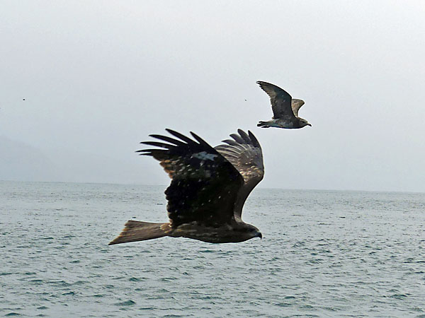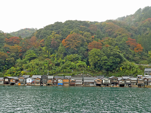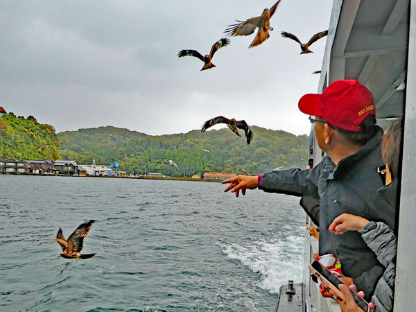 湾を取り囲む様にして建つ舟屋を海上から眺めるのは、陸地からではなかなか味わえない風景と趣がある。船に群がる鳥達にエサをあげるのも伊根湾めぐりの醍醐味のひとつ。船上は小雨模様でやや肌寒かったが、多くの方が甲板で伊根湾の風景を満喫。