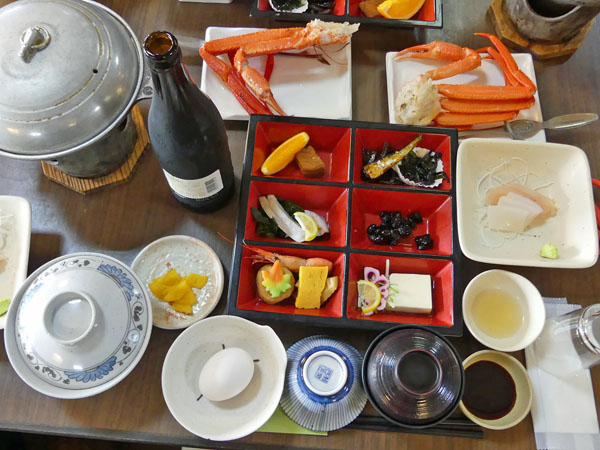 伊根湾巡り終了後はバスで天橋立へ移動。傘松公園下の「元伊勢籠(この)神社」駐車場に12時に到着。神社の境内を抜けてすぐの「松井物産本店」にて先ずお楽しみの昼食、ご当地名産の蟹をはじめ海の幸を堪能。