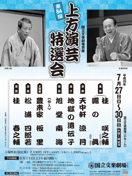 梅雨の明けた7月28日(木)枚方南支部会員64名の方々と地下鉄日本橋駅に近い国立文楽劇場の小ホールに、「上方演芸特選会」の鑑賞に行ってきました。日頃はあまり見かけない浪曲・講談・太神楽を始め、一般になじみの多い落語・漫才と多様な話芸を楽しみました。