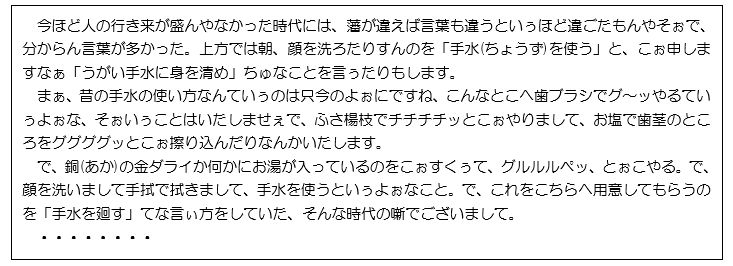 アップするのでしょうか。下記は落語「手水廻し」の台本の一部分で、落語らしい言い回しで書いていす。