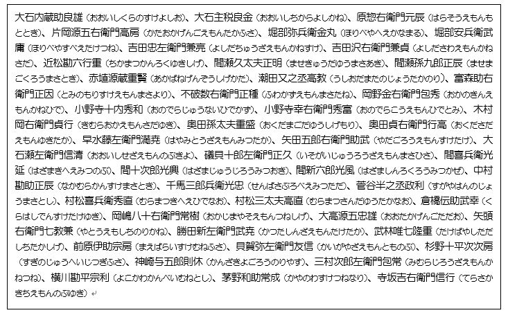 講談の旭堂南海さんが「講談師は記憶力が必要です」といって、赤穂浪士47名すべて(多分?)の名前を披露しました。ほんまにできるの?と思い、47名すべての名前を書き出してみました。誰か下記の記憶に挑戦してみませんか。
