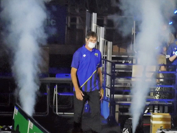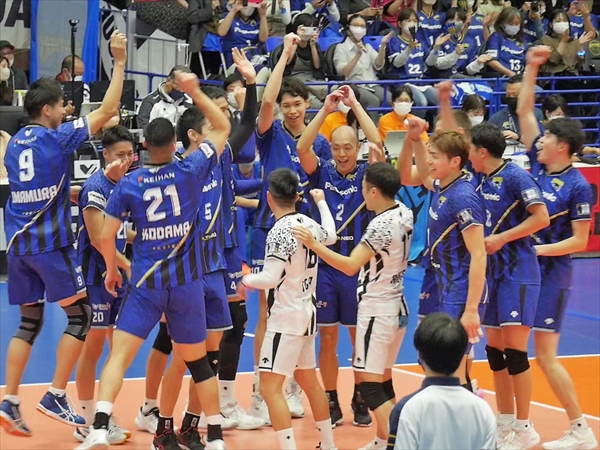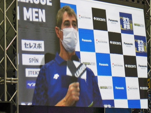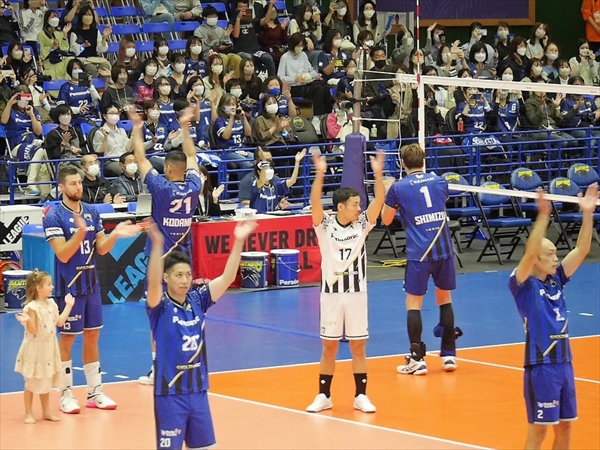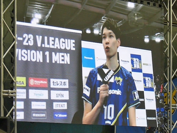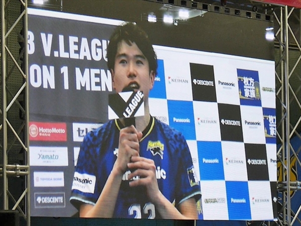 試合は最後、3-0で快勝です。その後、選手が観客へのあいさつ・記念撮影・ベストパンサー(VOM)小宮選手・山内キャプテン・ティリ ロラン監督のインタビューです