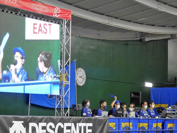 次は、応援の説明、パンサーズの選手紹介、写真撮影、始球式、両チームのスタメンの紹介などが続きます。軽快なDJのアナウンスで次第に盛り上がってきます。