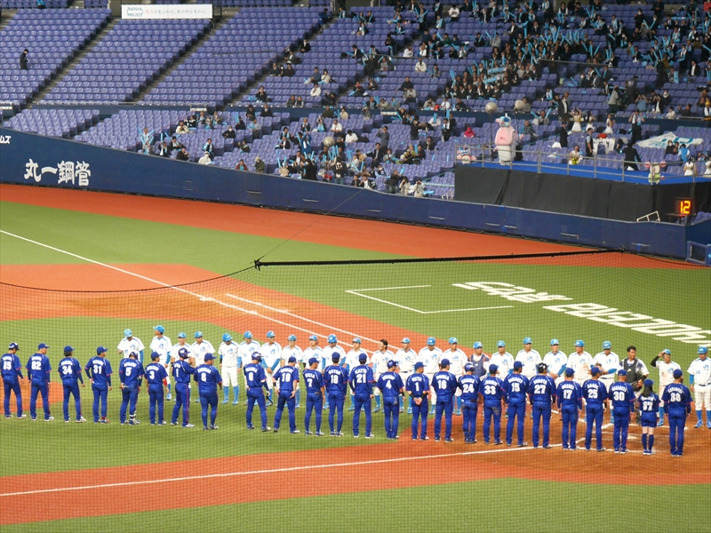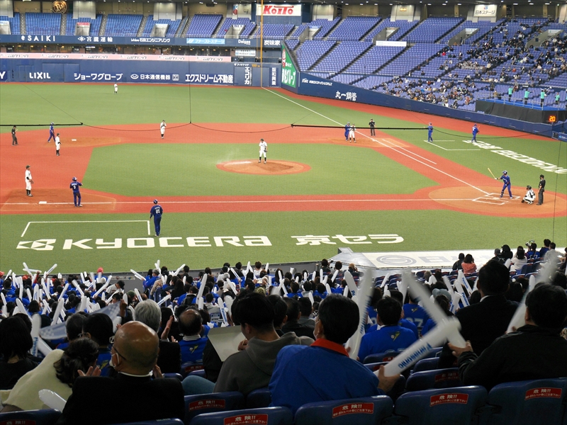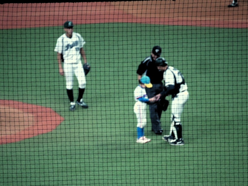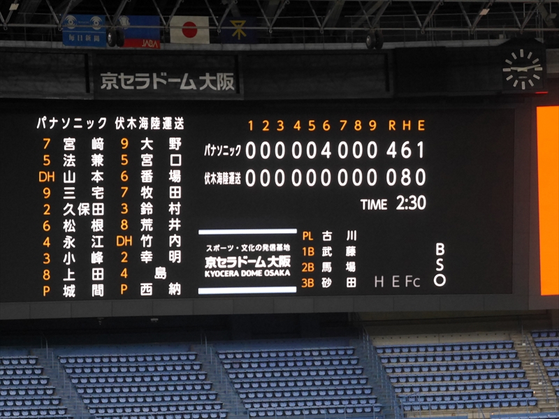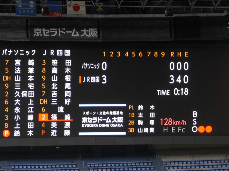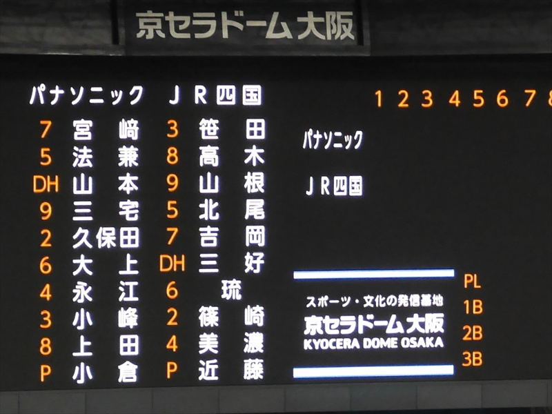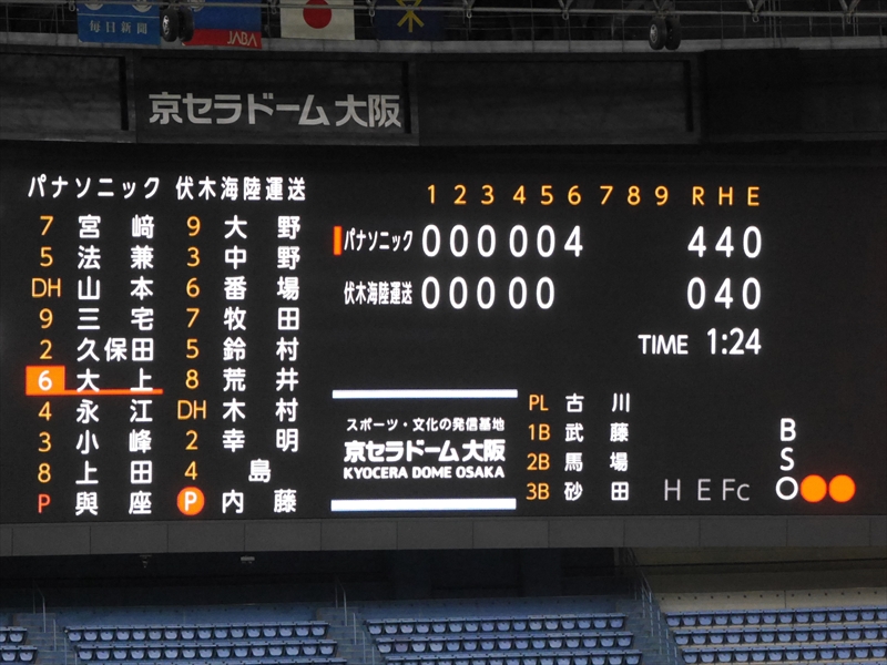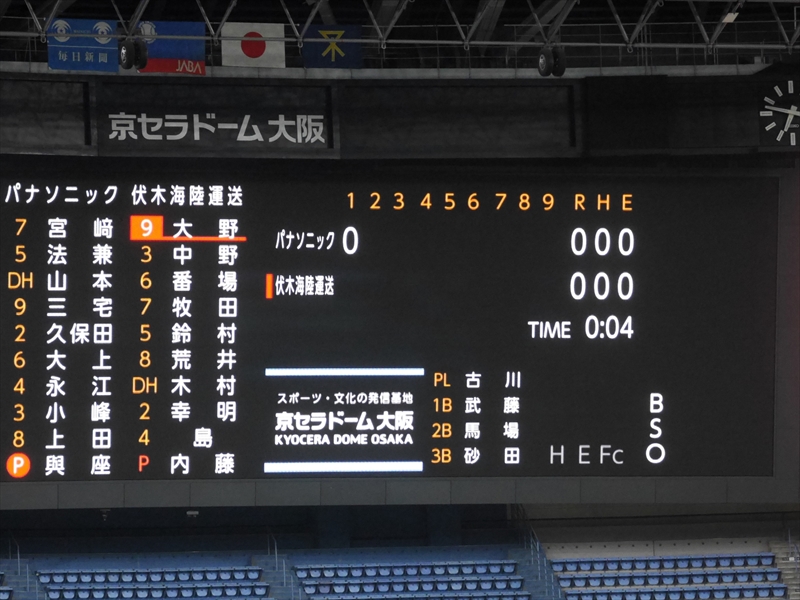 始球式のあと「試合開始」です。伏木海陸運送(富山)の先発は、内藤投手です。内藤投手は、150キロ近い球速でなかなか打てません。パナソニックの先発は、與座(よざ)投手です。與座投手はヒットは打たれますが、要所要所を抑え、両チーム無得点です。応援団も「オリジナルTシャツ」を着て声を張り上げ、スティックバルーンをたたき、一生懸命の応援です