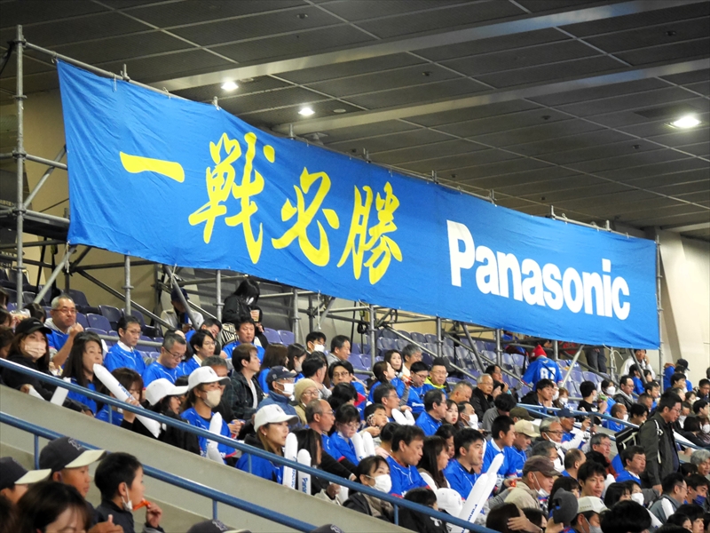今日は、定刻通り18時に試合開始。最初に、社歌の演奏・エールの交換のあと、パナソニックスポーツ(株)の久保田社長のあいさつ、選手のあいさつが終わると試合開始。頑張ってほしいと願いました。