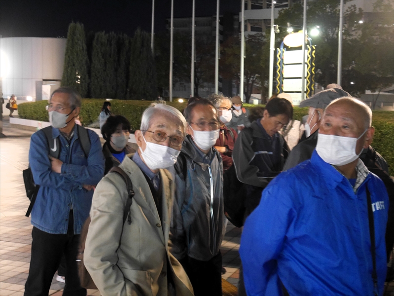 「枚方市立総合文化芸術センター本館西側(関西医大側)の道路」に、15:30の集合です。また、「寝屋川市役所駅前庁舎予定地(旧電通大駅前キャンパス)前」には、寝屋川支部などの方々は、16:00の集合で、合計36名の参加で、出発しました。18:00開始予定ですが、余裕をもって到着です。ここで問題発生です。パナソニック前の「第2試合」が、まだ対戦中です。