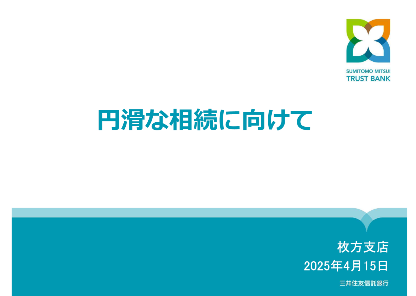その後、三井住友信託銀行枚方支店 稲葉支店長および木村主任よりご挨拶と銀行の紹介、ならびに当日の配布資料のご説明をいただき、いよいよ「円滑な相続に向けて」の講演が、同銀行の内田財務コンサルタントにより行われました。