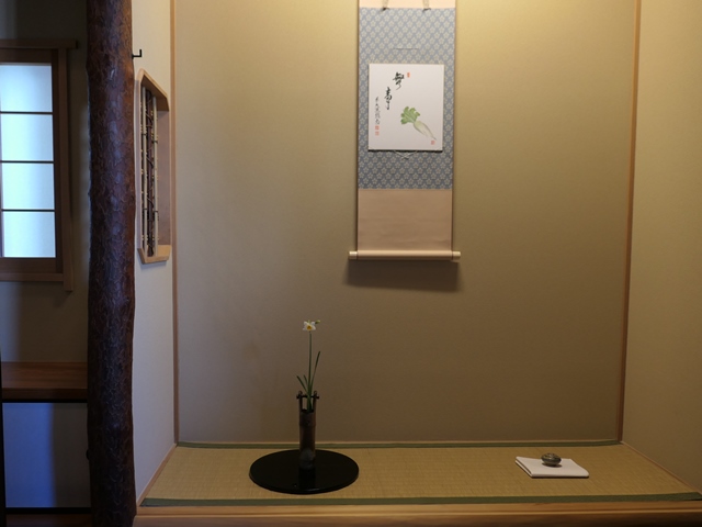 茶室入ります。鎖で下げられた釣釜、棚は宗旦好みの丸卓、正客席前の煙草盆、茶の心得「和敬静寂」の掛軸、茶花、香合・・・客を迎える亭主大友さんの気持ちが客室に溢れています。今日は新会員の岩本さんを迎える日でもあります。