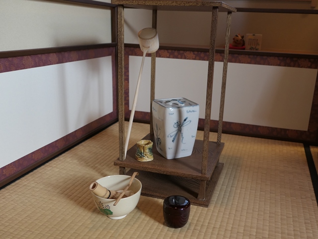 棚は四本柱の桑子卓(くわこじょく)です。木地は桑材、天板と中板の間が長く、四本柱が細くお瀟洒です。薄茶では天板中央に棗を、中段には細水指をおきます。濃茶のときは卓の前に茶入れを荘(かざ)りお点前を始めます。お点前の基本は平点前に同じです。お点前を終わるときは、柄杓は合(ごう)を向こう側にして、卓の勝手付側の2本の柱に斜めに立てて荘ります。水をつぐときは水指を卓から下ろして行います。