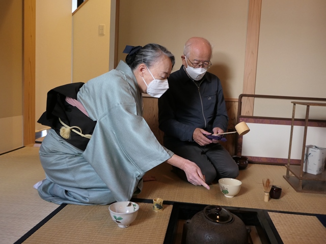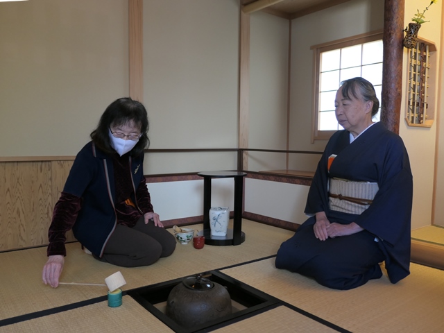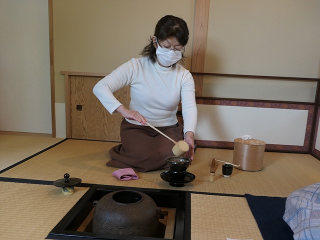 先月から参加の新会員さんのお点前の初披露がありました。数年間の経験がおありのようです。流れのある落ち着いたお点前に皆さん見入りました。茶筅通しが美しい、と大友さんからお褒めの言葉がありました。