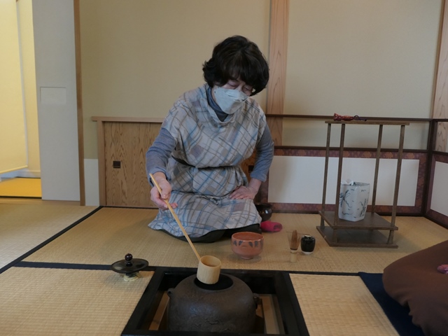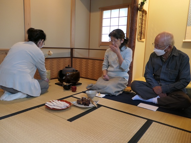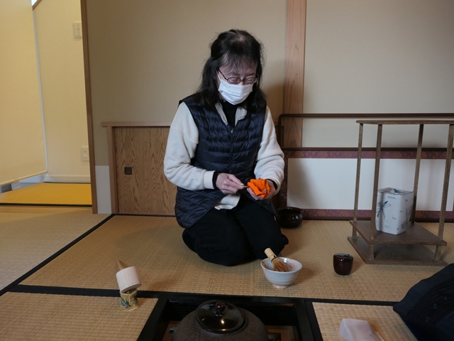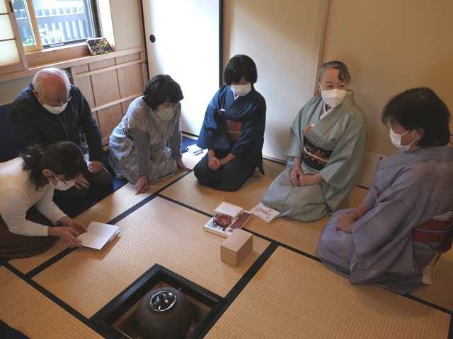 本年最後のお茶会は、大友さん宅の茶室でのリアルです。窓を開け、エアコン調節し、必要なとき以外はマスクをします。先月に続き、炉の薄茶点前と濃茶点前の稽古をしました。