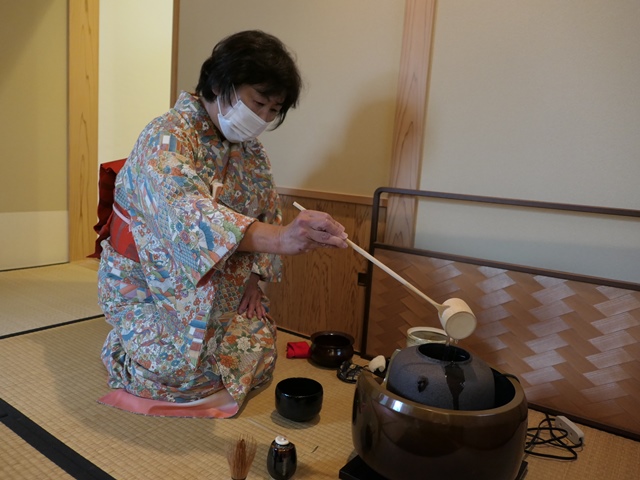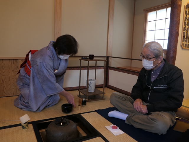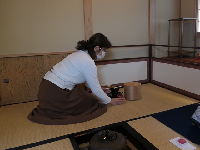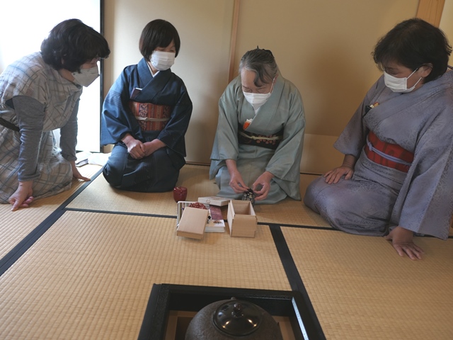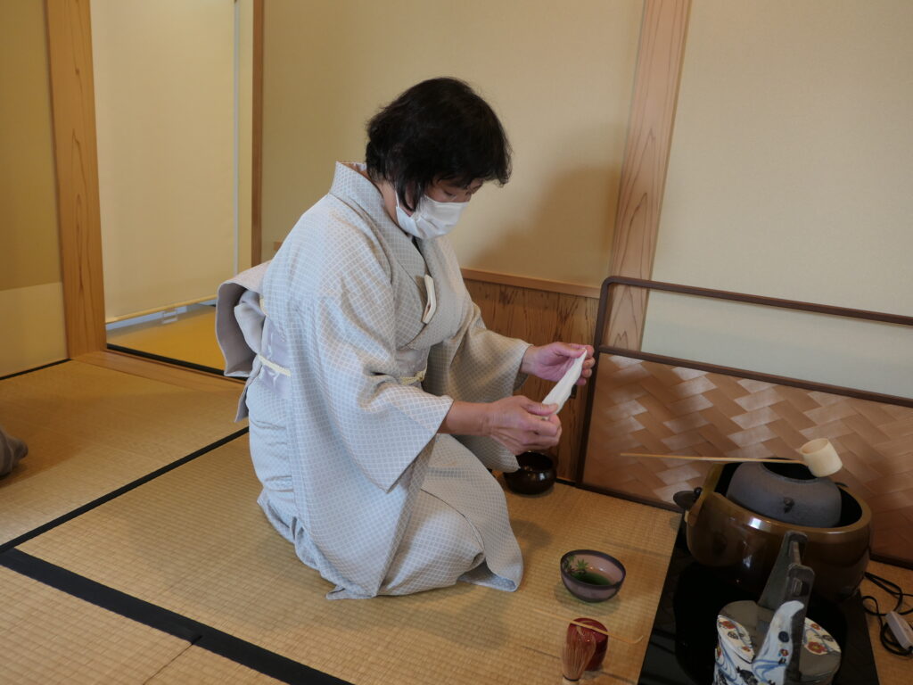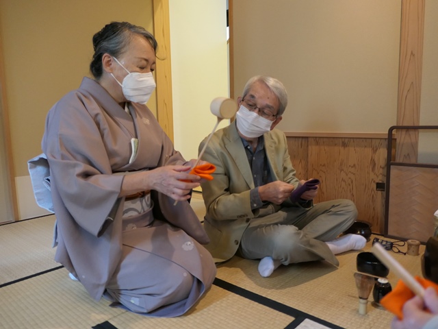 今回もコロナで濃茶は各服点です。長盆は使用せず、略形式で替茶碗扱いで行いました。一人一碗ですから、一人分の濃茶を上手に練るのは難しく、皆さんまだ時間がかかりそうです。