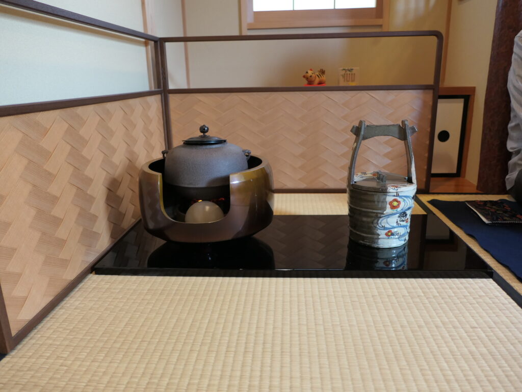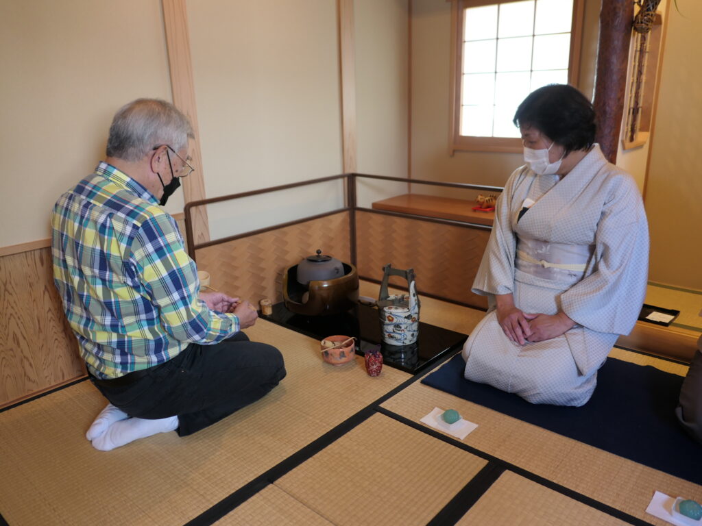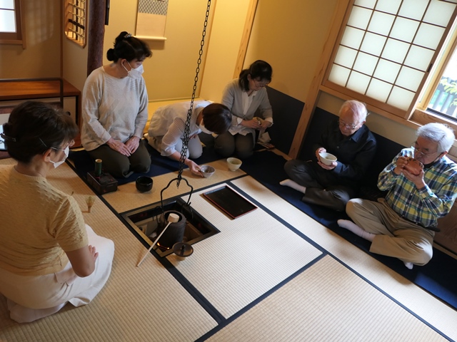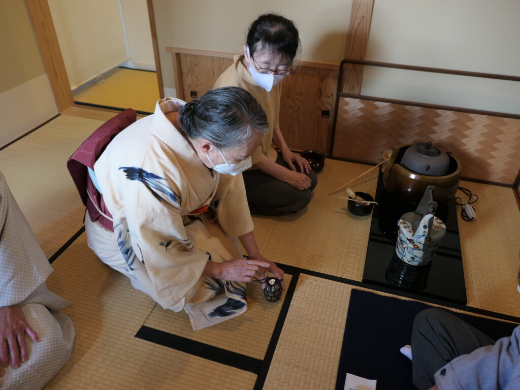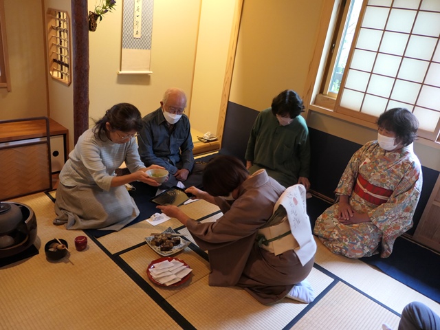 この10月はコロナも下火になり、4か月ぶりのリアル例会を大友さん宅の茶室で開催できました。例年10月は名残の月で、窯の置き位置を工夫したこの月だけの中置(なかおき)点前です。半年間親しんだ風炉の茶を惜しみ、少し肌寒くなったこの季節、わずかに釜を客に近づけて温かみを感じてもらう趣向です。