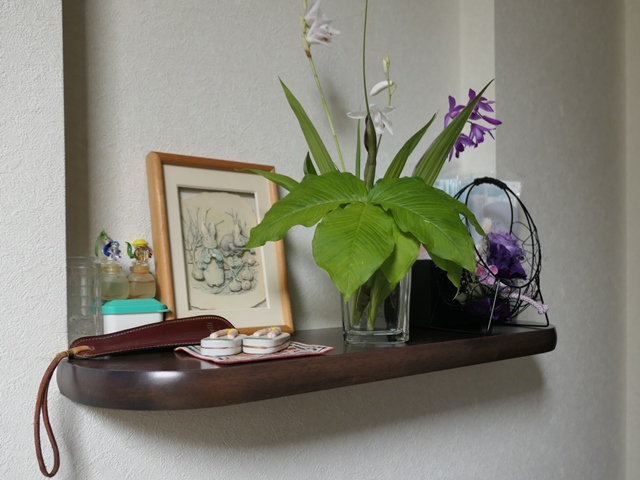 玄関の花:シラン(紫/白)、カラスビシャク 茶花:姫ひおうぎ