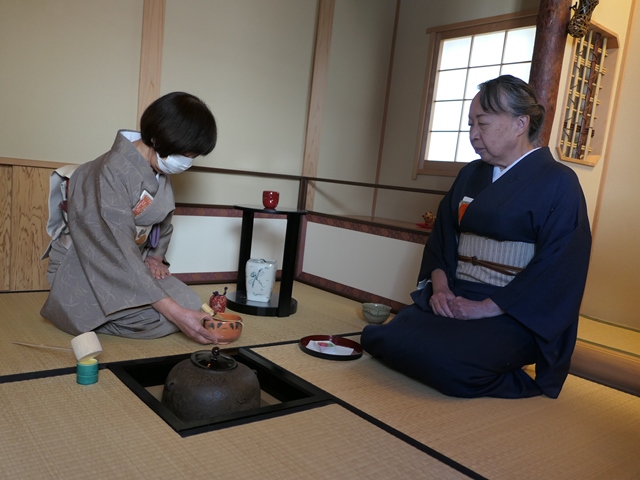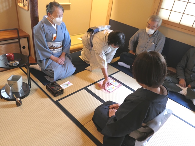 - 次客は盆を取り込み、それぞれ順に盆を送りながら茶碗を取ってお茶をいただきます。