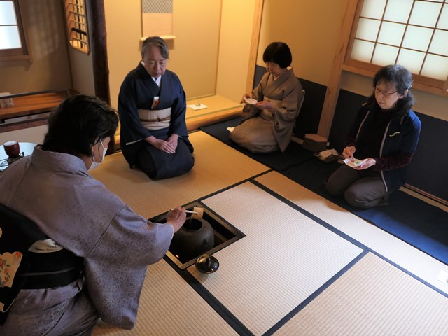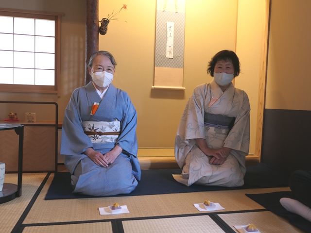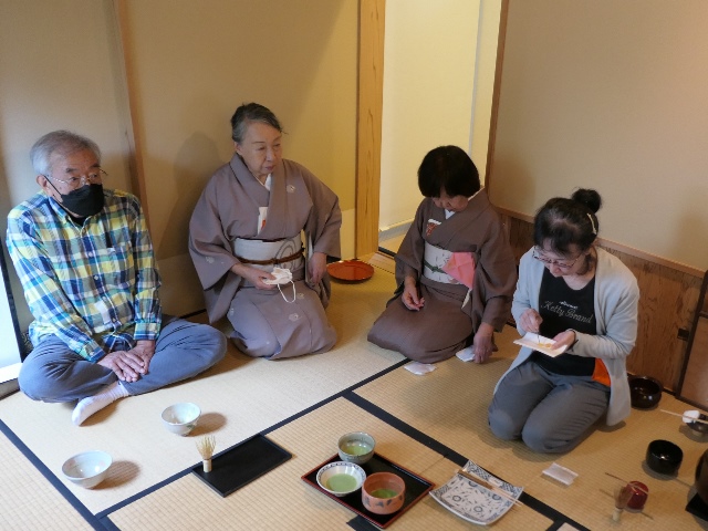 お茶席は9人が2組に分かれて時間をずらして、美味しいお茶をゆっくり楽しむことができました。木々に囲まれた落ち着いたところでのお茶一服は格別でした。