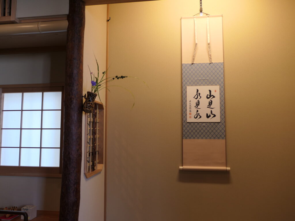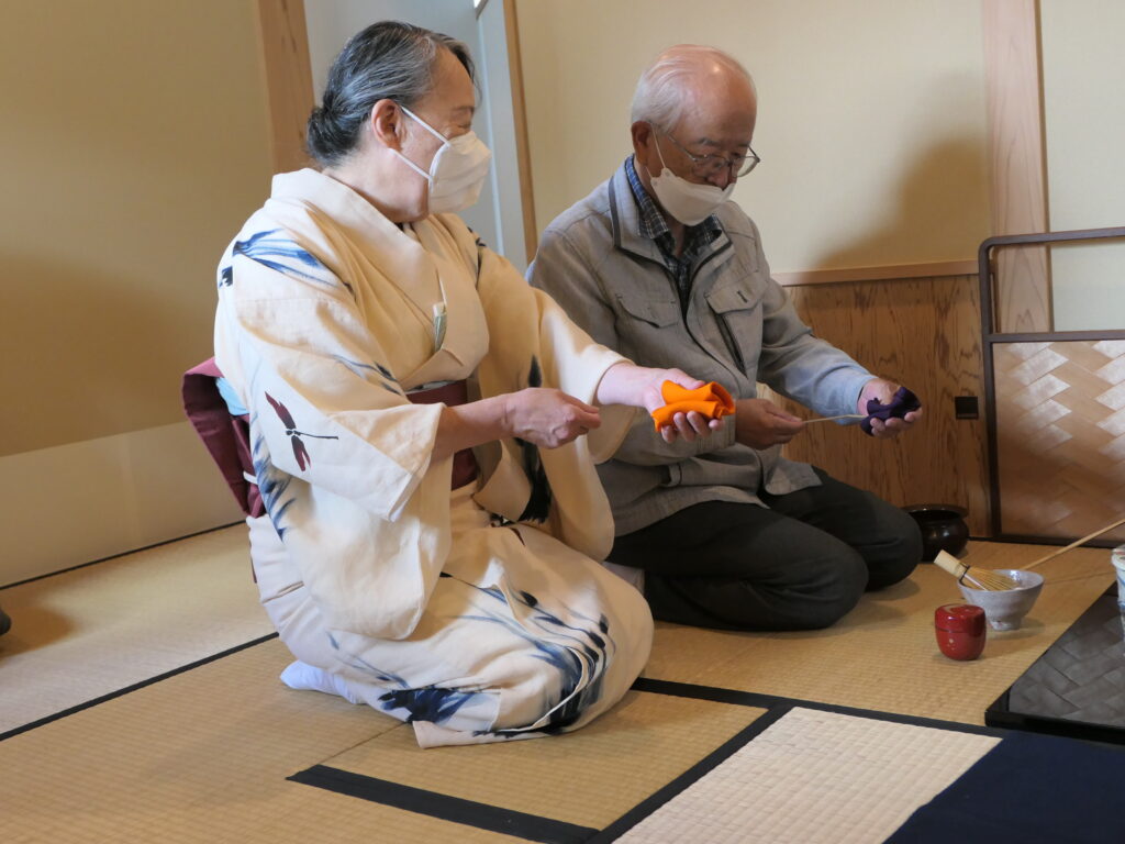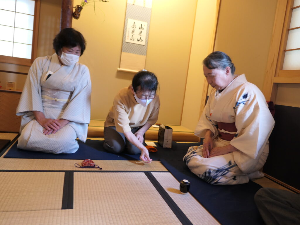 今日は久しぶりにお点前をされた方もいて、それぞれが基本を復習する機会にもなりました。帛紗の持ち方やさばき方、柄杓を持つ手の位置、茶碗を拭く小茶巾の扱いも確認できました。 また、掛軸の禅語の意味も教えていただき、茶道の奥深さも味わえた一日でした。