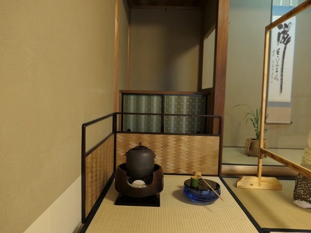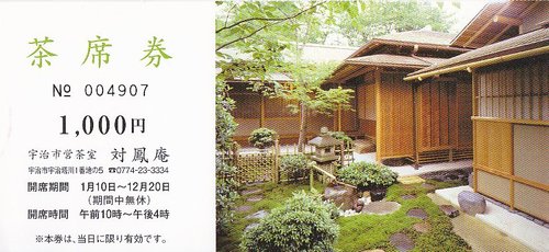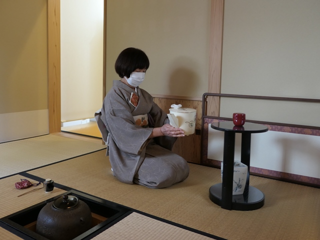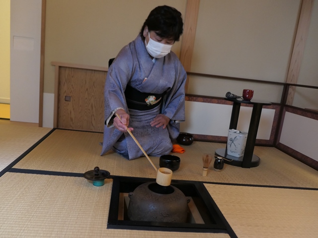 さて、茶室は宇治市観光センター内の敷地にある「対鳳庵」で、平屋の別建屋になっています。ここも客は私どもだけです。茶室の玄関には「在釜」の木札がかかっています。「お釜を炉にかけています、お気軽にどうぞ!」という意味だそうです。
