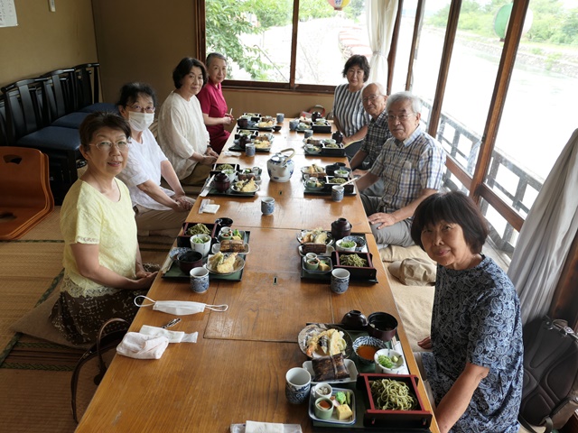 お昼は宇治川沿いの「鮎宗」で食事です。昼さなかですから鵜飼はありませんが、気分はそのつもりです。ゆっくり腹いっぱいのご馳走でした。