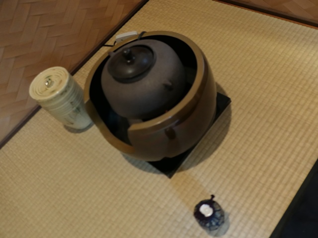 久しぶりに見る釣釜は 暖かくなって炉も終わりに近づくと、少しの火で湯が沸く小釜の釣釜を使うそうです。煙草盆は「お楽にどうぞ」の気持ちを示す茶具で、最初から正客席の前に置いておき、客はお菓子が出される前に右横のヘリ外におき直します。